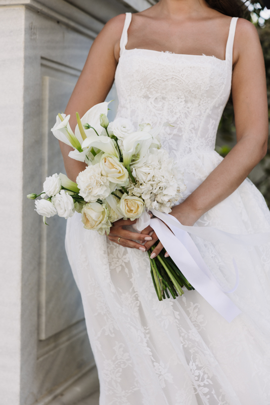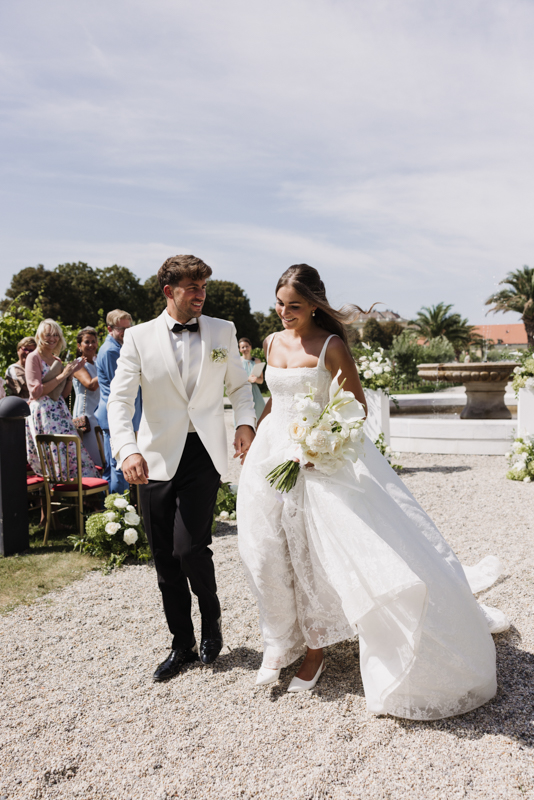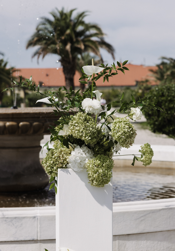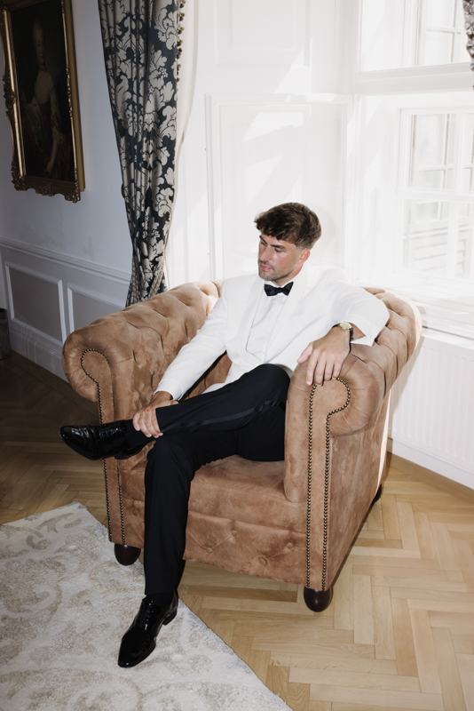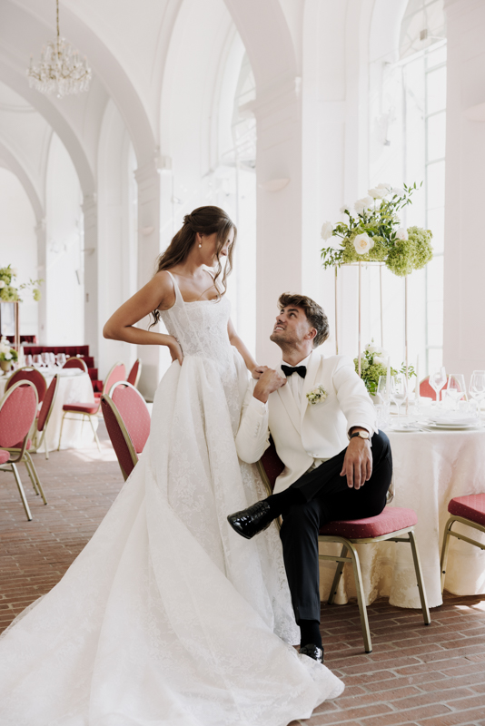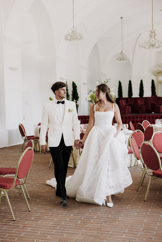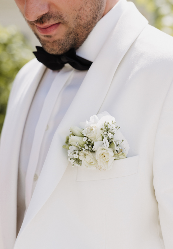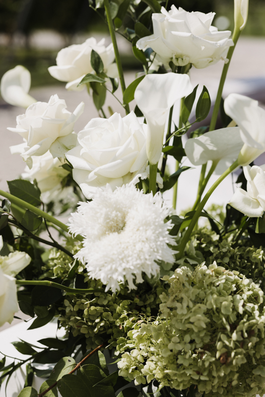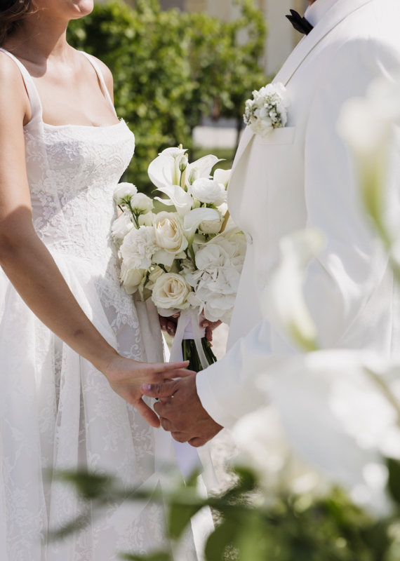 Das Brautkleid, fließend und edel zugleich, harmonierte perfekt mit dem modernen, stilvollen Look des Bräutigams. Weiße Blumenarrangements zogen sich als roter Faden durch Dekoration, Brautstrauß und Tischgestaltung – ein Symbol für Reinheit, Eleganz und klare Ästhetik.